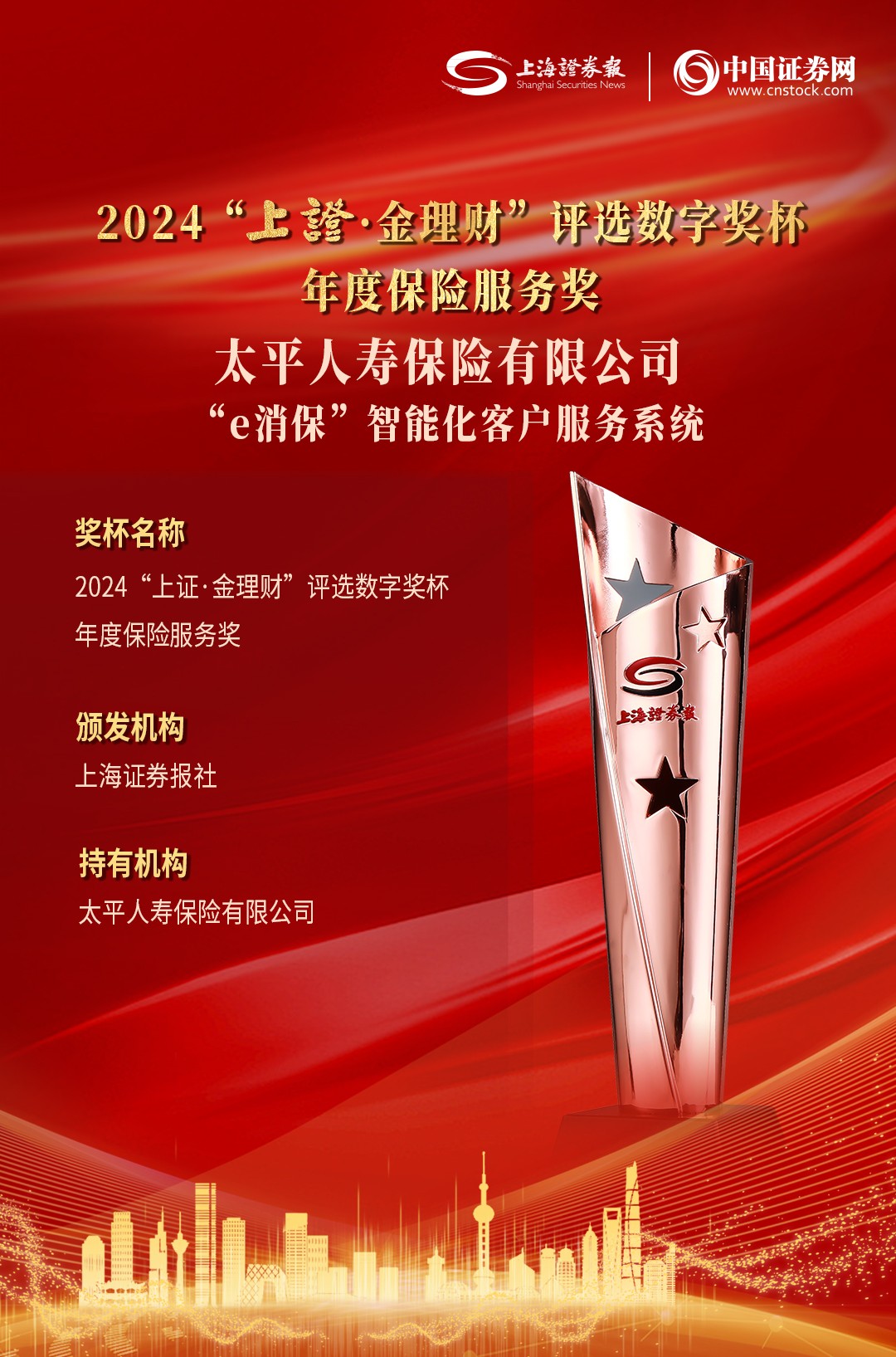 日前,由上海證券報·中國證券網(wǎng)主辦的2024“上證·金理財”評選頒獎典禮正式舉辦。太平人壽憑借高質(zhì)量發(fā)展和踐行金融五篇大文章的優(yōu)異成果,在眾多金融品牌中脫穎而出,榮獲年度保險保障品牌、年度保險服務(wù)兩項大獎。