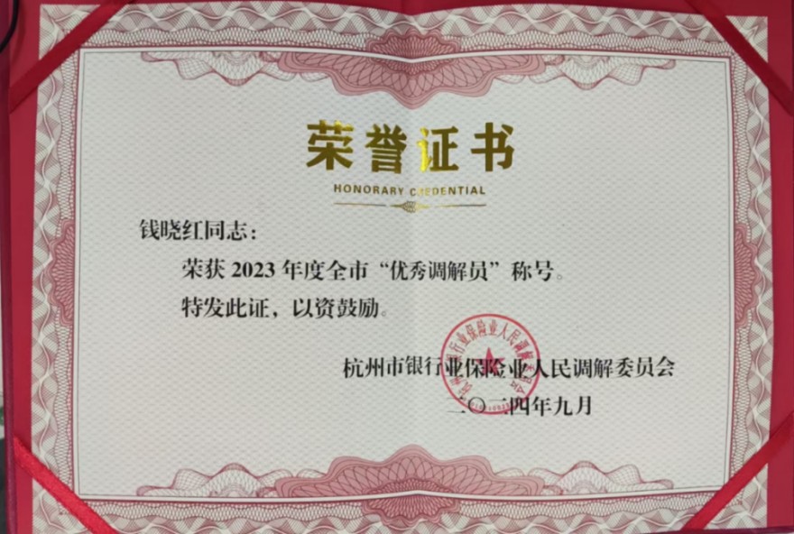 浙江分公司兼職調(diào)解員錢曉紅獲評(píng)年度“優(yōu)秀調(diào)解員”稱號(hào)