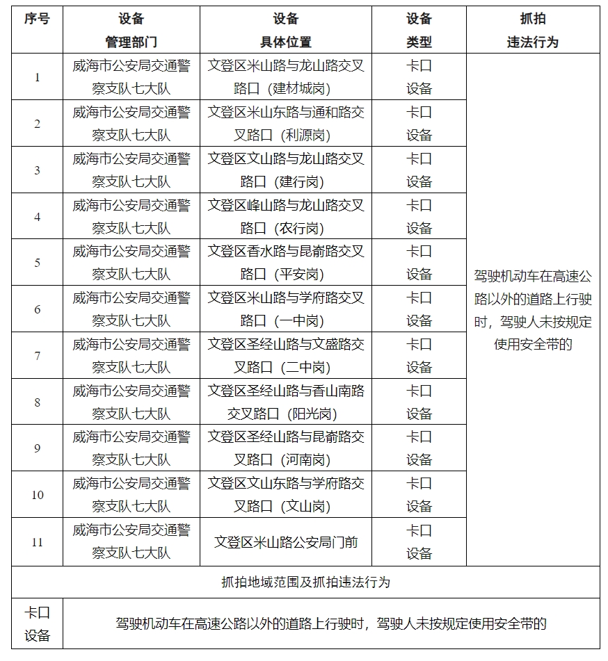 為保證道路交通安全,預(yù)防和減少交通事故的發(fā)生,根據(jù)《中華人民共和國(guó)道路交通安全法》及其實(shí)施條例等法律法規(guī)和相關(guān)技術(shù)規(guī)范的規(guī)定,依據(jù)《公安機(jī)關(guān)執(zhí)法公開(kāi)規(guī)定》,現(xiàn)將文登區(qū)啟用的11處共11個(gè)交通技術(shù)監(jiān)控設(shè)備予以公示,自4月9日起,將對(duì)有關(guān)交通違法行為進(jìn)行依法管理,請(qǐng)廣大交通參與者自覺(jué)遵守道路交通法律法規(guī),共同維護(hù)良好的道路交通環(huán)境。