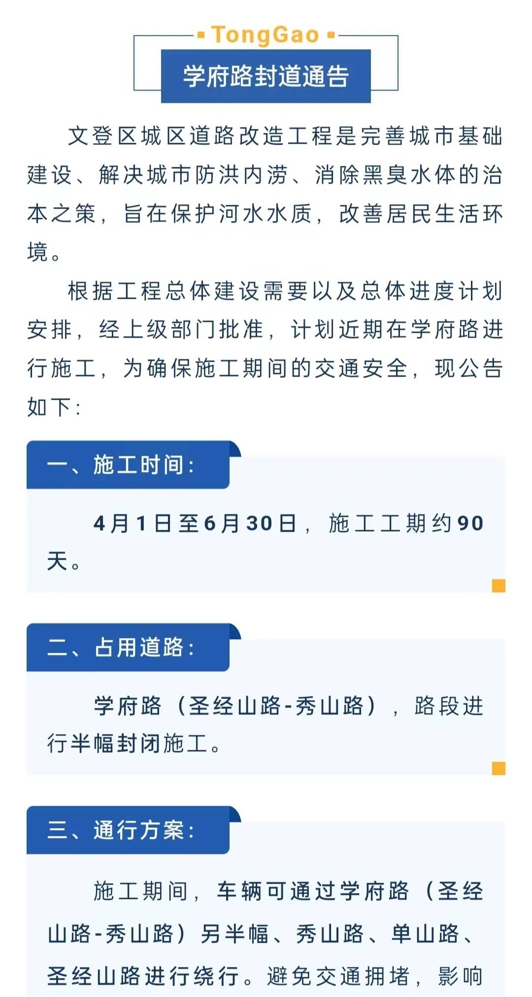 4月1日至6月30日,文登區(qū)學府路封道通告