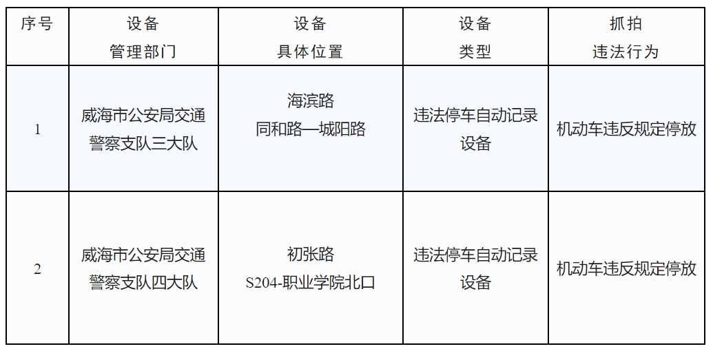 為保證道路交通安全,預防和減少交通事故的發(fā)生,根據(jù)《中華人民共和國道路交通安全法》及其實施條例等法律法規(guī)和相關技術(shù)規(guī)范的規(guī)定,依據(jù)《公安機關執(zhí)法公開規(guī)定》,現(xiàn)將威海市新增2處交通技術(shù)監(jiān)控設備予以公示,自6月3日起,將對有關交通違法行為進行依法管理,請廣大交通參與者自覺遵守道路交通安全法律法規(guī),共同維護良好的道路交通環(huán)境。