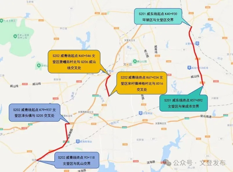 目前文登區(qū)境內(nèi)S201威東線K40+930(環(huán)翠區(qū)與文登區(qū)交界)至K57+892(文登區(qū)與榮成市交界)、S202 威青線K60+546(文登區(qū)麥疃后村北與G206威汕線交叉處)至K67+034(文登區(qū)宋村鎮(zhèn)神格村北與X016交叉處)、S202威青線K79+937(文登區(qū)澤頭鎮(zhèn)與S205交叉處)至K93+118(文登乳山交界)等三處路段進行路面改造施工。