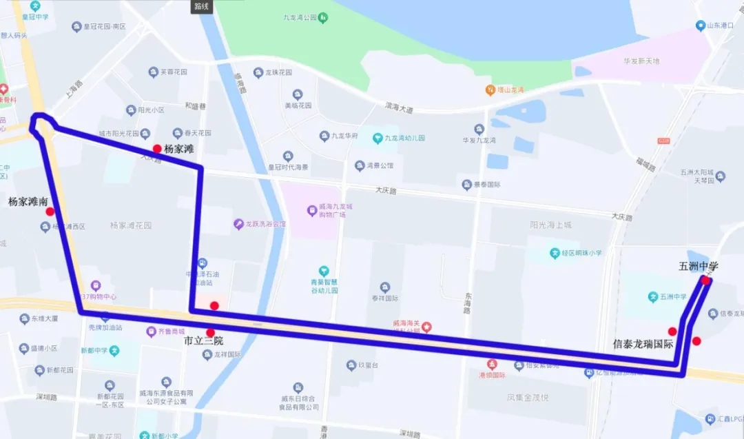 由楊家灘站點始發(fā)(大慶路北側(cè)),途經(jīng)大慶路、海濱南路、齊魯大道、城子路、齊魯大道、黃海路、大慶路至楊家灘。
