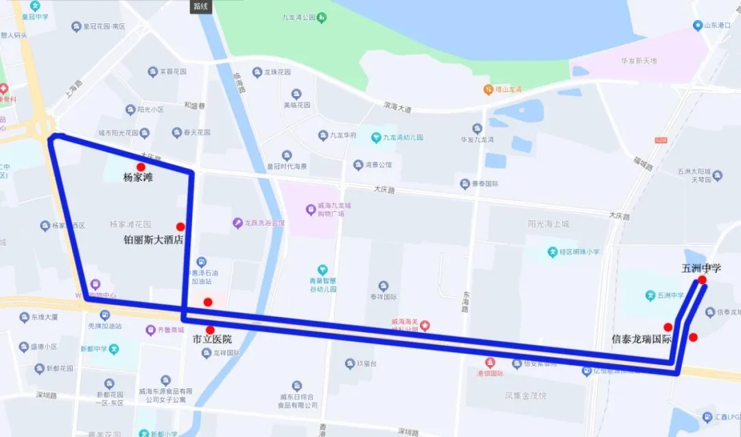 站點設(shè)置:楊家灘、鉑麗斯大酒店、市立三院、信泰龍瑞國際、五洲中學(xué)、信泰龍瑞國際、市立三院、楊家灘。