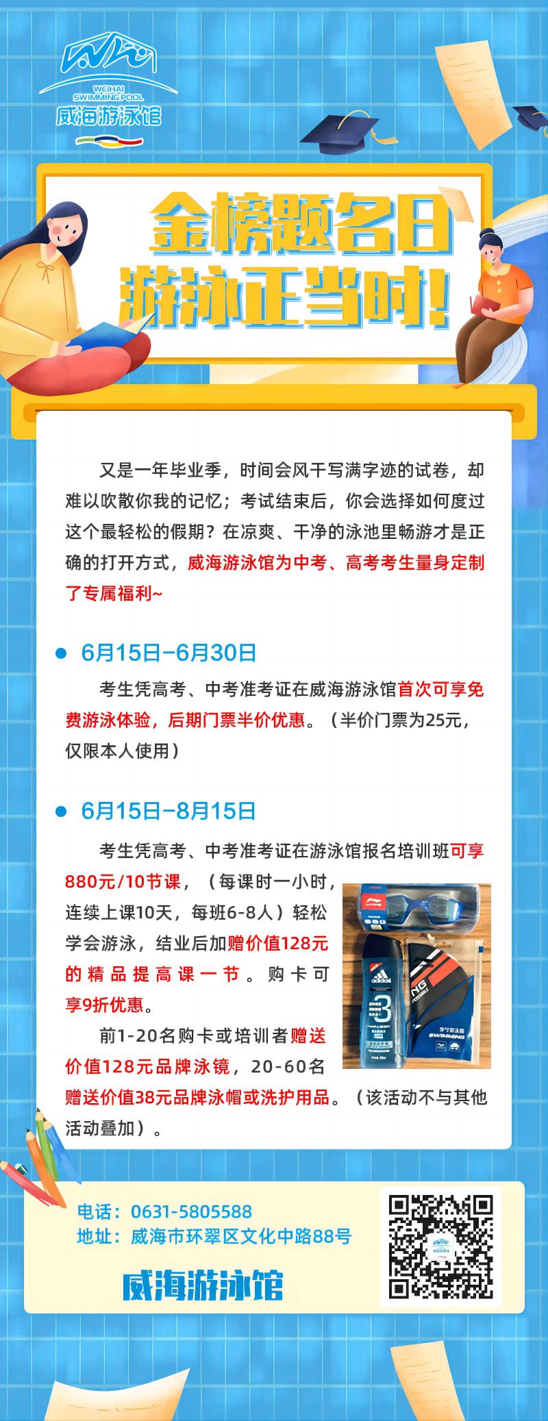 6月15日-6月30日考生憑高考、中考準考證在威海游泳館首次可享免費游泳體驗,后期門票半價優(yōu)惠。(半價門票為25元僅限本人使用)