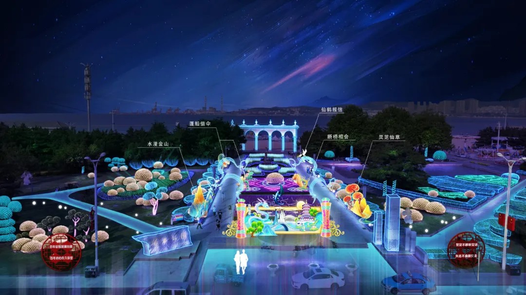 高區(qū)在高新廣場布置一組“山海畫卷”立體景觀,主體造型以卷軸為本,以海洋文化為題材,融入海洋動植物、浪花、祥云、海鷗等元素。廣場四周樹木、草坪上采取紅燈籠、水母燈、詩詞燈柱、網(wǎng)燈等燈飾和“毛衣樹”裝飾進(jìn)行全方位裝點,達(dá)到晝夜皆景。同時,在世昌大道、文化路、環(huán)海路、火炬八街等重要路段和重要節(jié)點的行道樹上懸掛燈籠,綠地里布置燈飾。